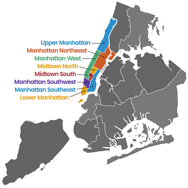 The borough of Manhattan has been subdivided into eight commercial waste zones: Upper Manhattan, Lower Manhattan, Manhattan Northeast, Manhattan West, Manhattan North, Manhattan South, Manhattan Southwest and Manhattan Southeast.